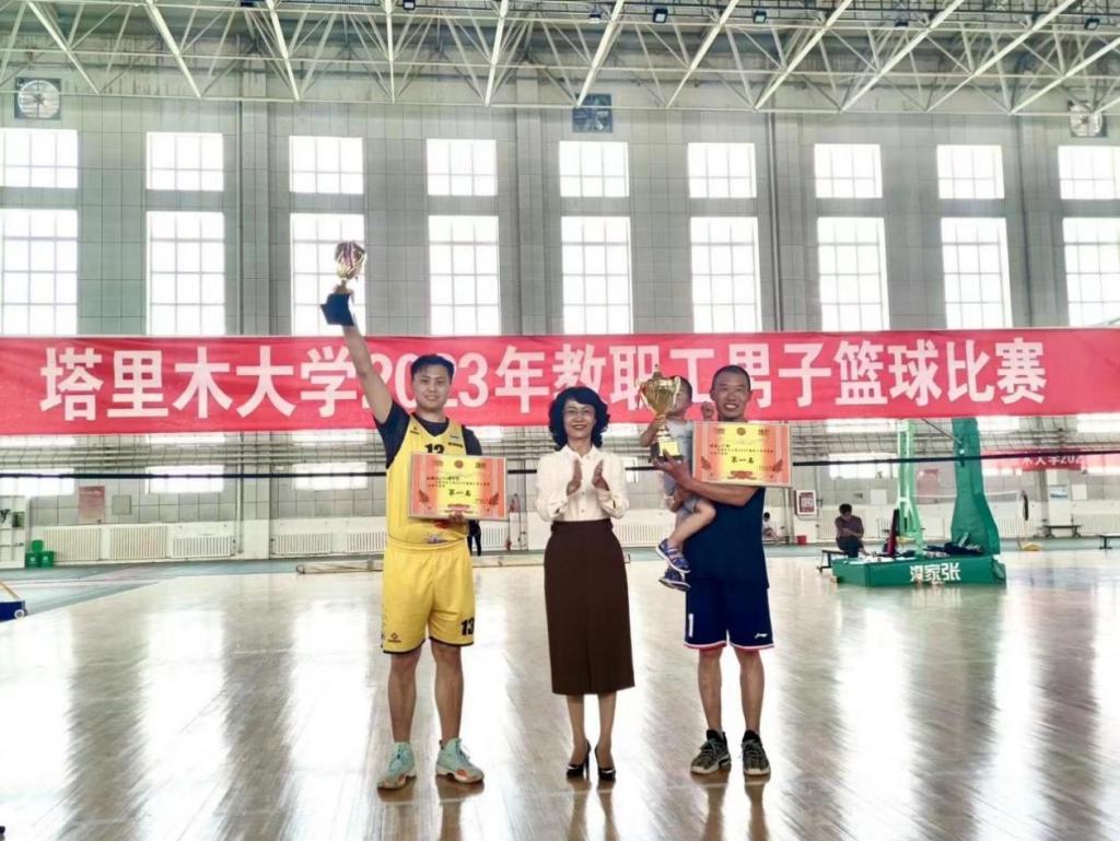 教职工组成的篮球队在比赛中荣获第一名的成绩,张爱萍校长为机电院男篮队伍送上冠军奖杯,并表示祝贺。
