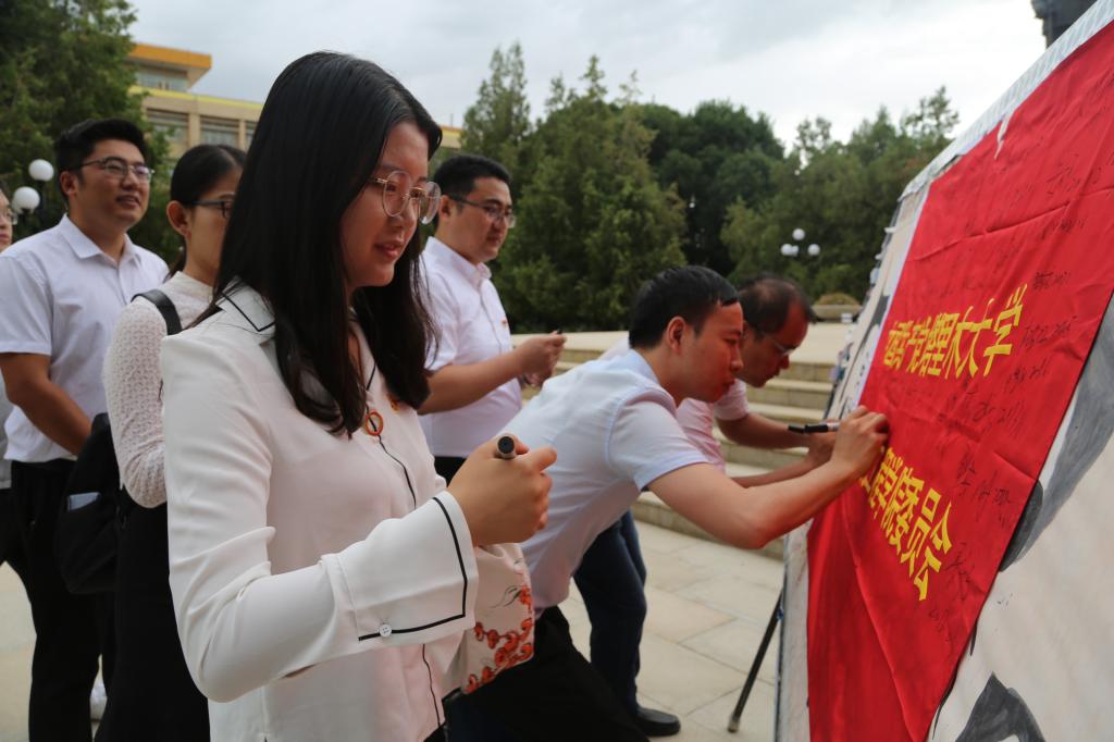 党委副书记、院长弋晓康向现场所有的党员介绍了“什么是党员的政治生日”,并带领现场所有的党员在院旗上签下了自己的入党日期和名字。随后大家参观了校史馆。走进校史馆,一幅幅照片,一件件物品,都承载着塔大胡杨精神。