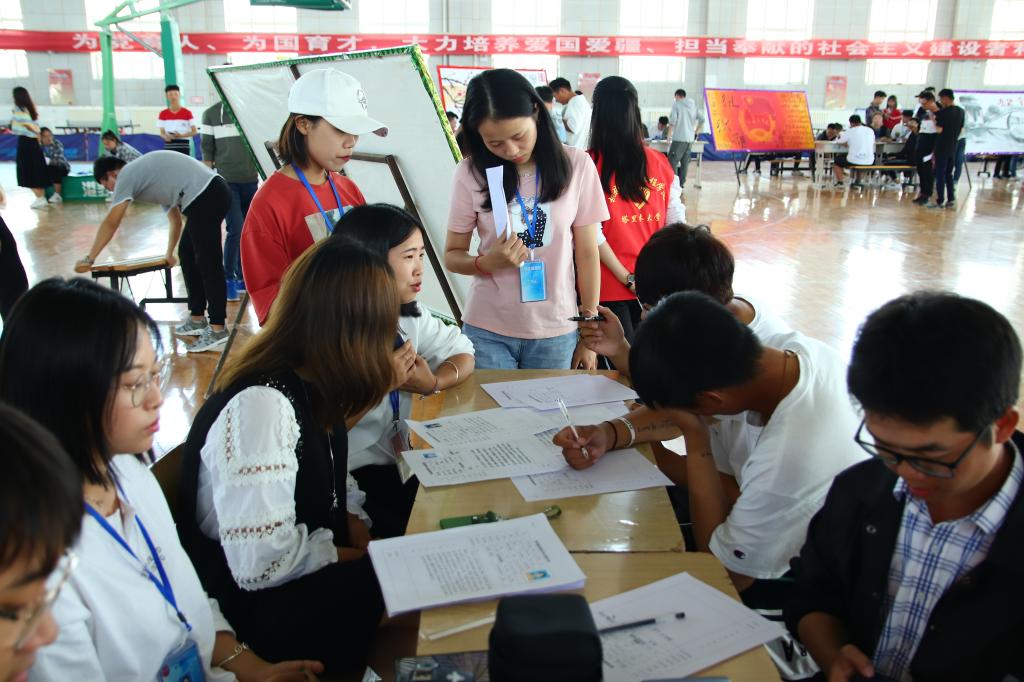 27日中午,纳新大会在风雨操场展开,团委学生会各部门成员将自制的展牌摆放在活动场内,并为前来参观的2019级新生们耐心介绍。现场气氛热烈,新生们选定了心仪的部门后纷纷踊跃报名。