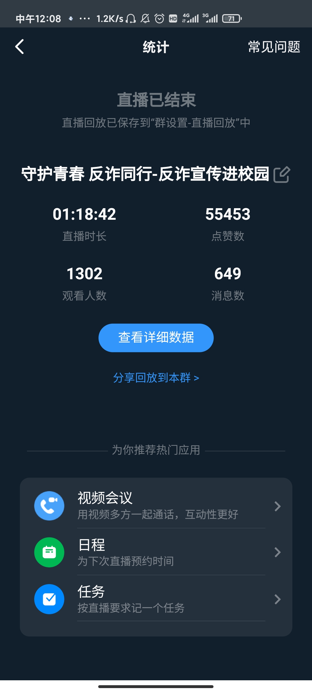直播过程中主要围绕大学生群体常面临的网络兼职刷单、冒充好友、冒充客服、网络贷款、购买游戏账号等案例为同学们进行深入浅出的讲解,直播中大家认真听讲,积极与警官互动,全院上下共有1302人实时在线观看直播,消息数达到了649,点赞数高达55453。