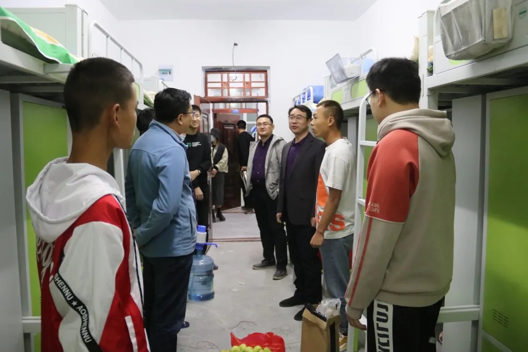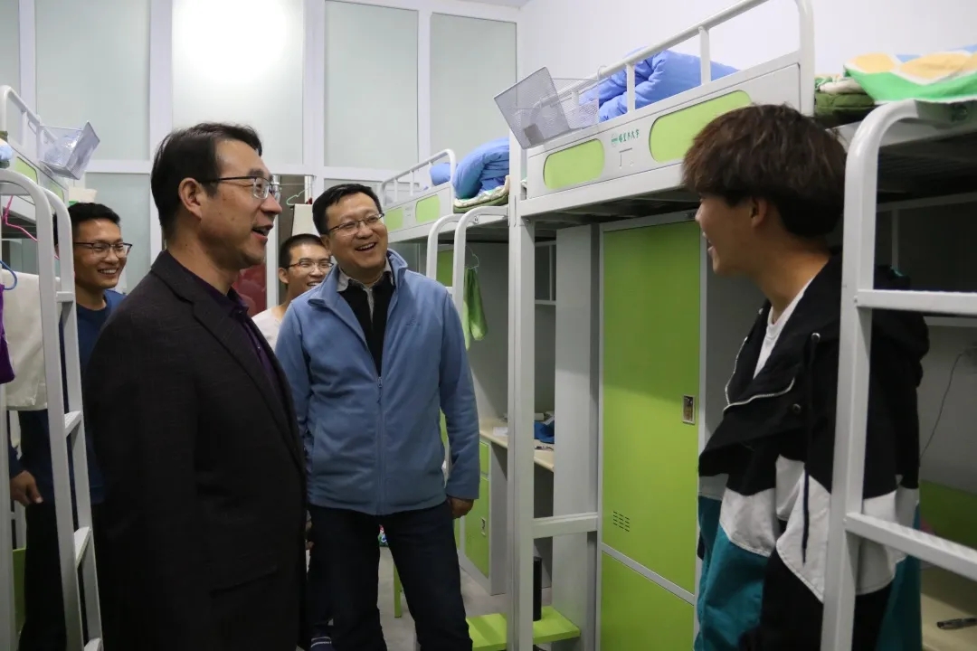 王旭峰一行先后来到西区13号、1号学生公寓楼看望2020级新生。每到一处,王旭峰、张宏都与新生亲切的交流,详细的了解新生来自哪里、是否适应新的环境,同时检查宿舍设施是否完备、齐全;同时,王旭峰还提醒大家要注意宿舍卫生,保证宿舍干净整洁。