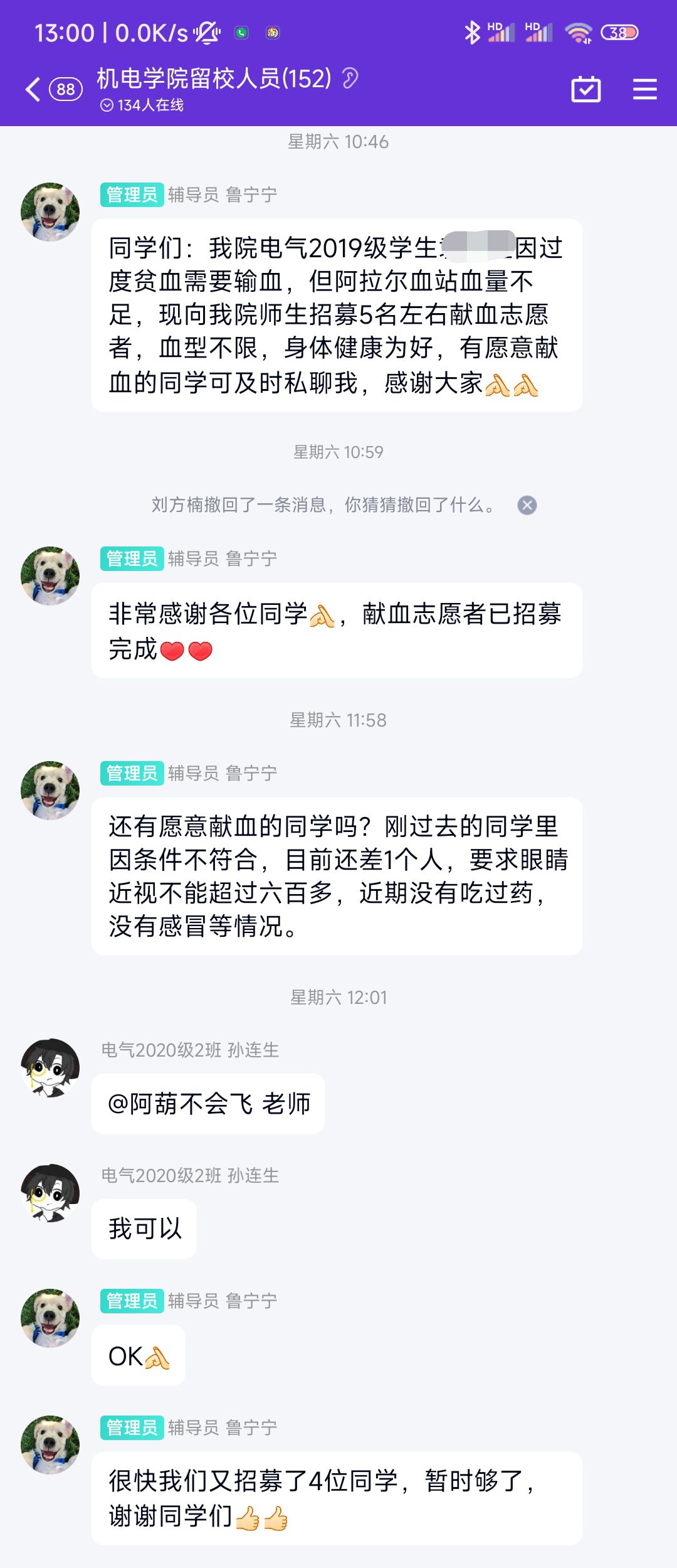 再次紧急招募了4名今年退役的大学生志愿者,火速赶到血站,有序开展献血,确保了治疗用血第一时间到达病房。