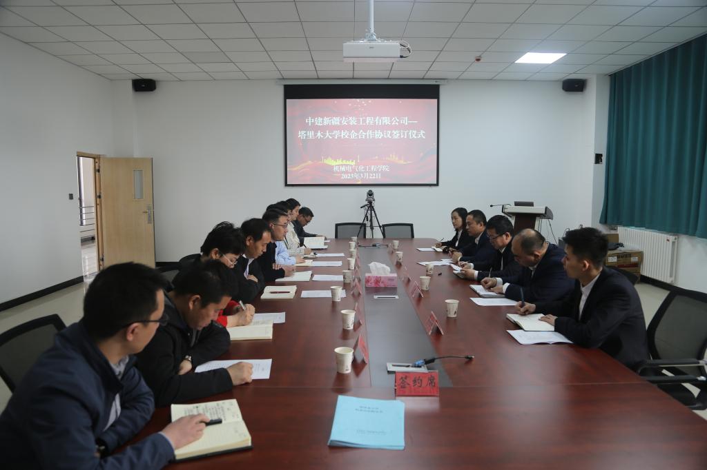 与中建新疆安装工程有限公司在东扩区一期D323会议室举行校企合作签约仪式。中建公司党委副书记段云辉、技术质量部经理张岩、管理部经理张志鲁,综合办公室主任高延成、综合办公室高级经理杨晶晶;成人在线
