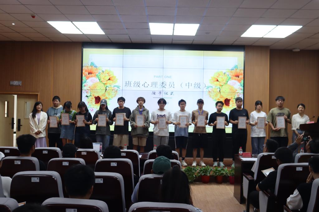 开展心理健康月活动总结暨班级心理委员授予仪式。学生工作办公室副主任鲁宁宁、心理辅导员段阳阳、成人在线