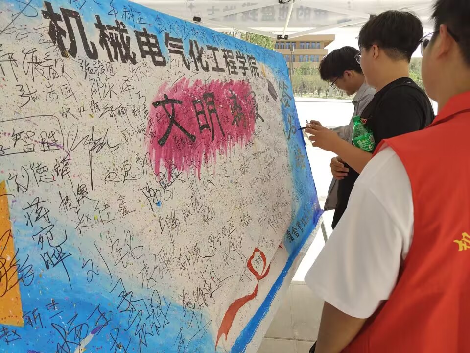 在本次活动中,毕业年级辅导员袁伟和宿委会工作人员准备好了“文雅离寝,文明离校”的活动海报、“文明离寝”签名墙和纪念品。签名现场气氛活跃,毕业生们积极参加,在签名的同时工作人员也将自己的美好祝愿予以表达,也借此让毕业生们再次感受塔大的温暖以及在校期间的美好回忆。毕业生停下脚步拿起手中的笔,郑重的签上了自己的名字,表达了“一个签名、一份承诺”的决心,表示要以实际行动创建文明、整洁的宿舍环境。