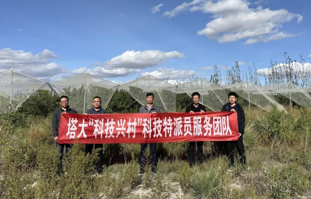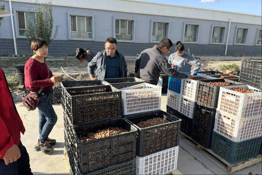 吊干杏科技服务团队成员王红飙、郭文松、王宪磊、胡灿、邢剑飞等到第一师四团吊干杏种植基地、吊干杏加工厂等开展科技服务工作,在吊干杏种植基地,团队成员与农户深入交流,了解今年吊干杏受天气影响情况,就吊干杏来年如何预防冰雹等灾害给予了指导,对吊干杏加强营养管理和病虫害防治与农户探讨交流,提高吊干杏树的产量和品质。