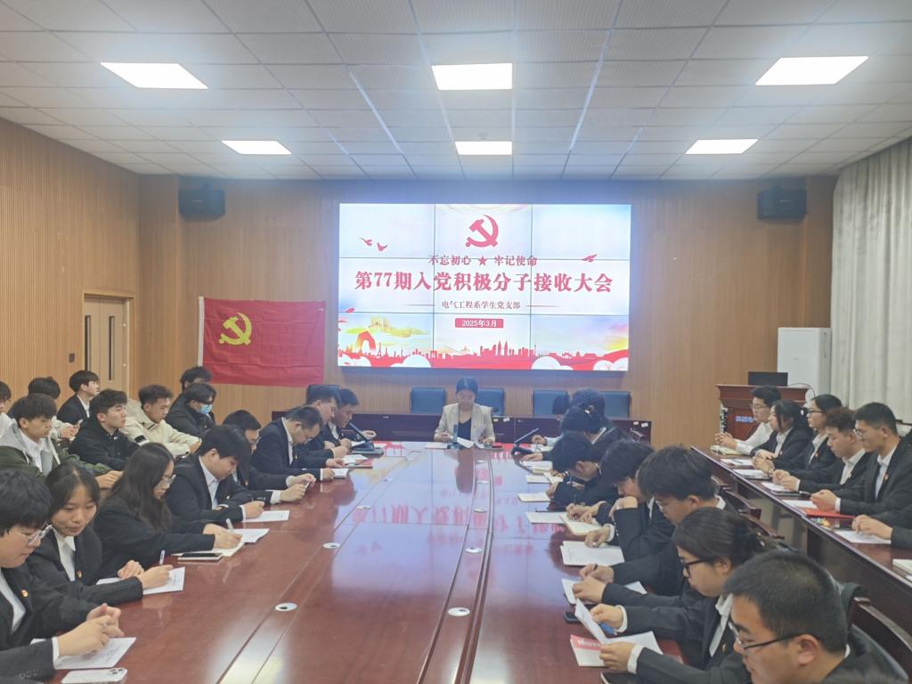 为切实做好入党积极分子的确定和培养教育工作,进一步壮大党员队伍,3月26日,电气工程系学生党支部于机电楼D108会议室召开了2025年春季积极分子接收大会。会议由支部书记鲁宁宁主持,全体党员参加。