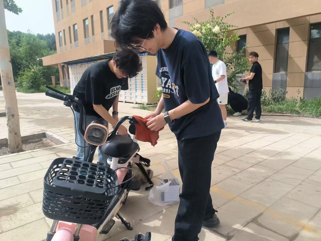 活动现场,党员同志们身穿红马甲,有序引导车辆停放,并运用专业工具,按标准化流程完成清洗、擦拭、检查等工作。烈日下,党员们分工协作,从高压冲洗车身到细致擦拭车辆,每个环节都一丝不苟。他们热情周到的服务,赢得了同学们的一致好评。